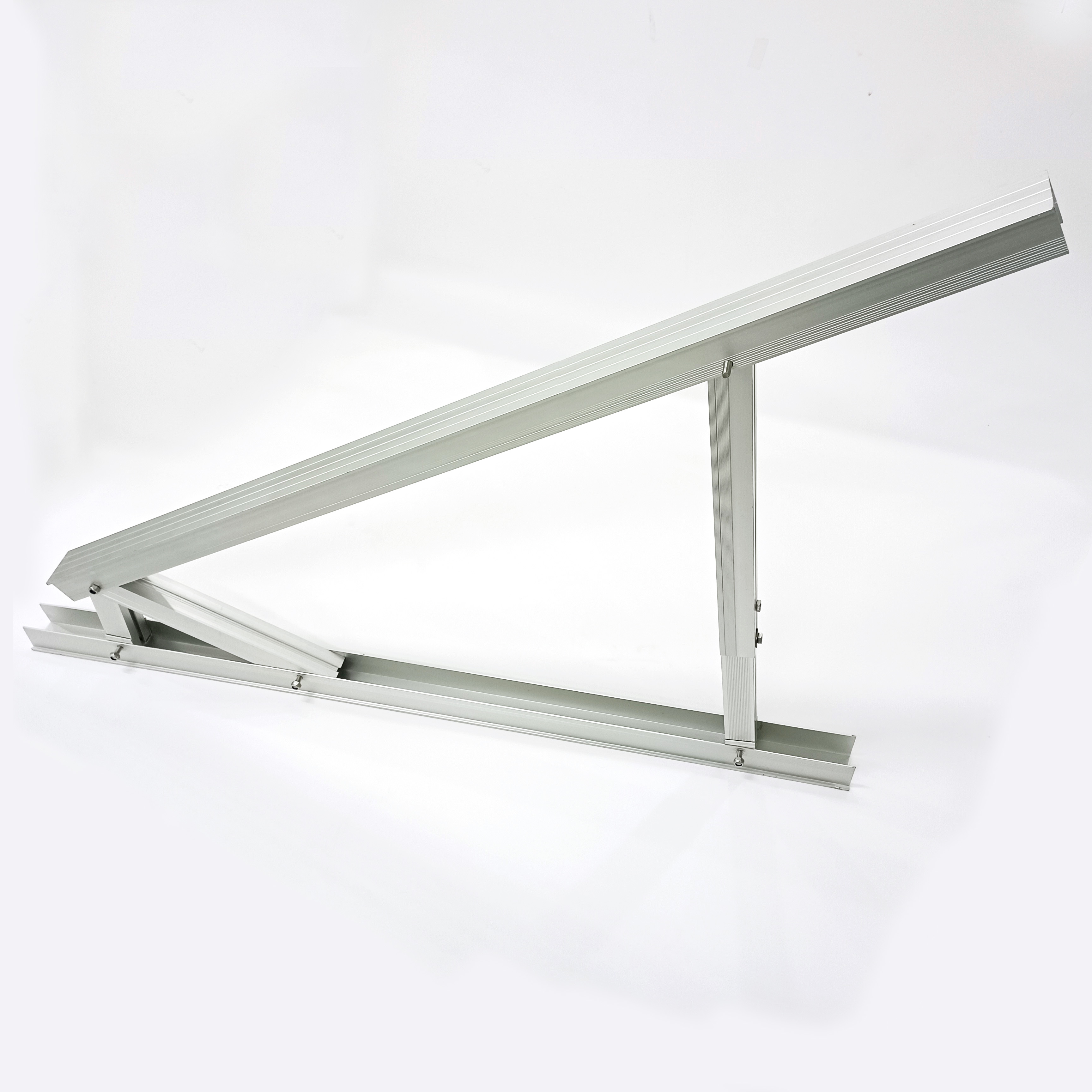 O suporte triangular geralmente é feito de materiais metálicos, como liga de alumínio ou aço inoxidável, que apresentam boa resistência à corrosão e à pressão do vento. Este suporte foi concebido para ser simples e estável, capaz de suportar eficazmente o peso dos painéis solares e proporcionar boa estabilidade e resistência ao vento através da sua geometria triangular. Os três vértices de um tripé são geralmente conectados ao solo ou outra estrutura fixa para formar um ponto de suporte sólido.